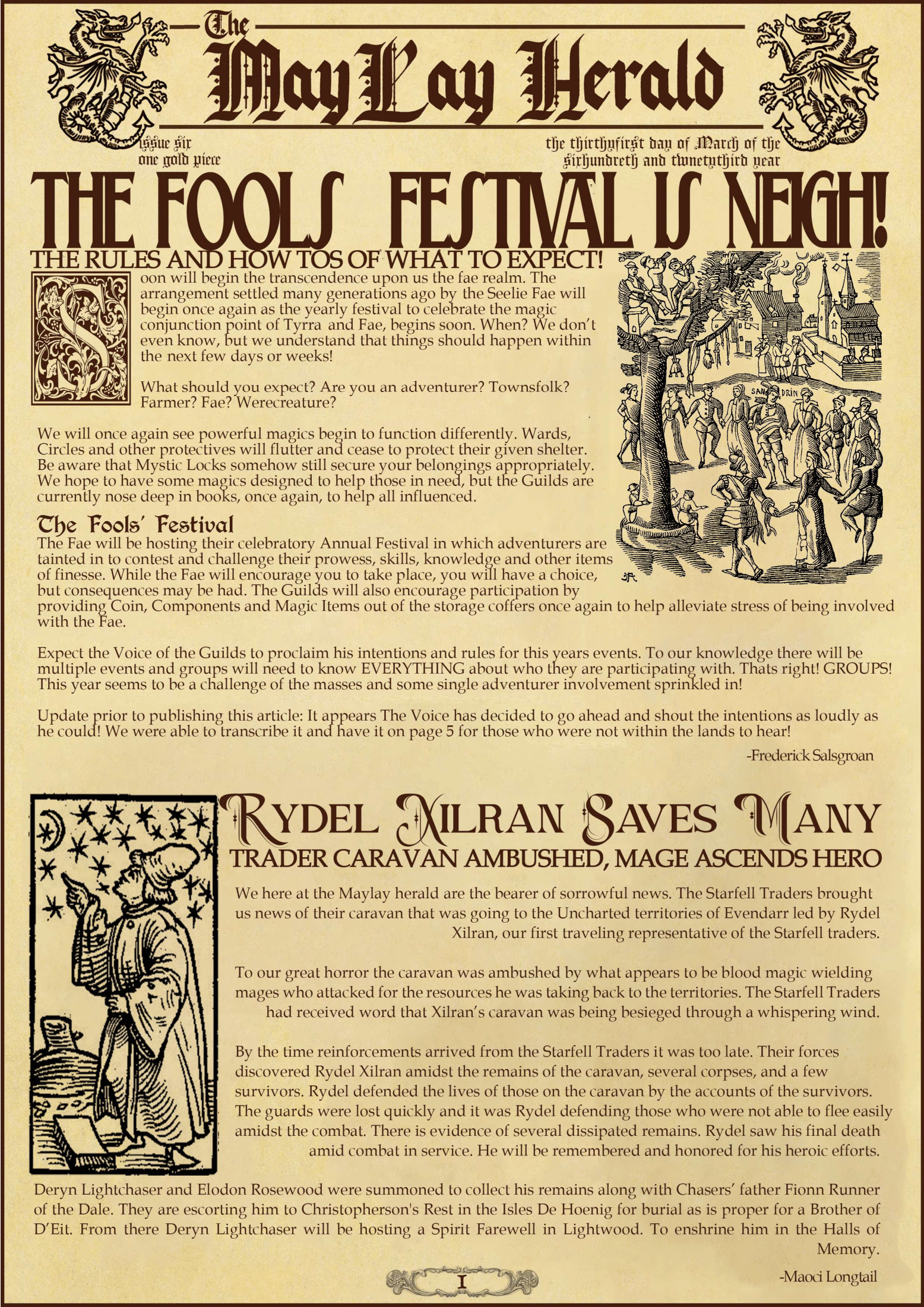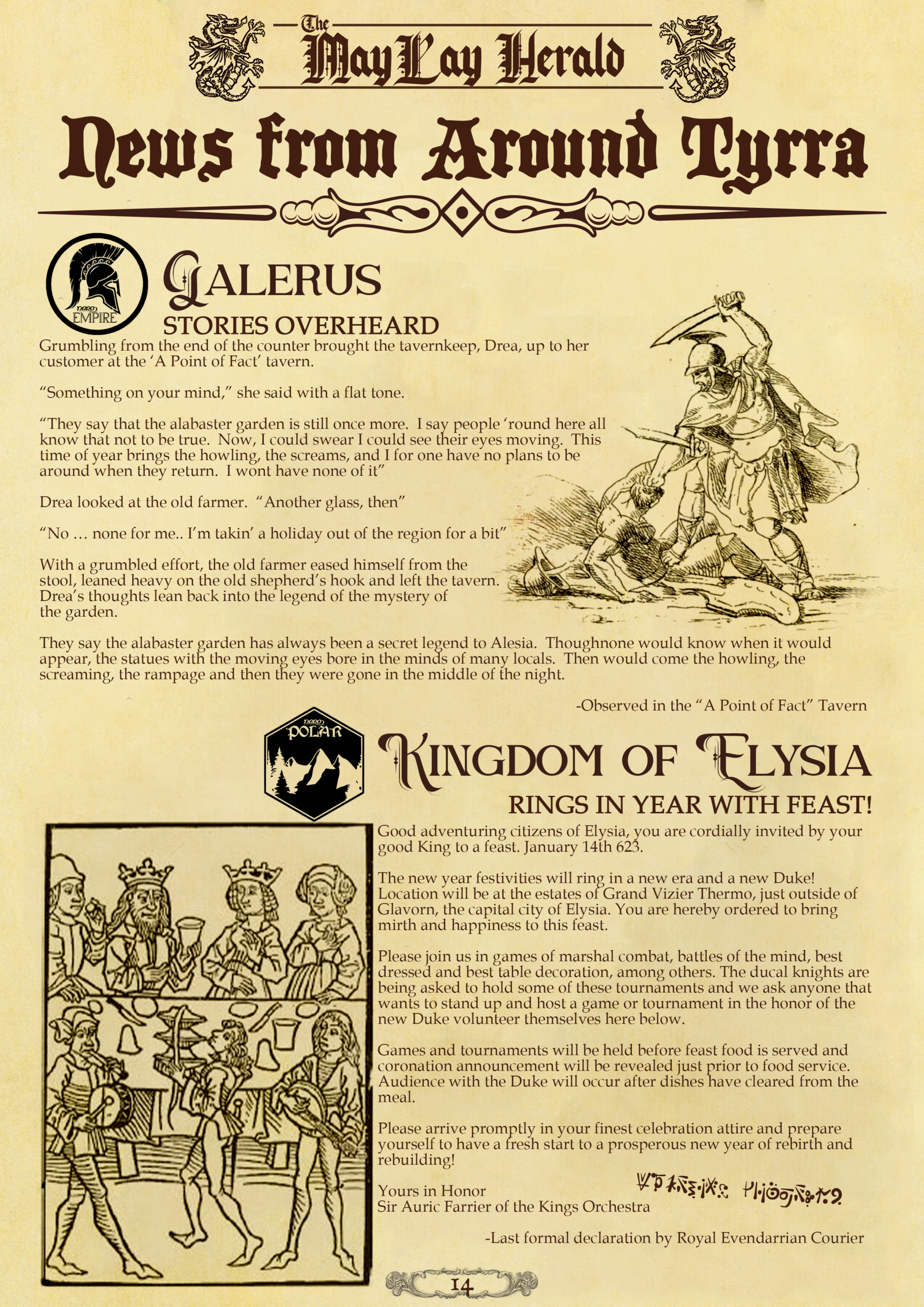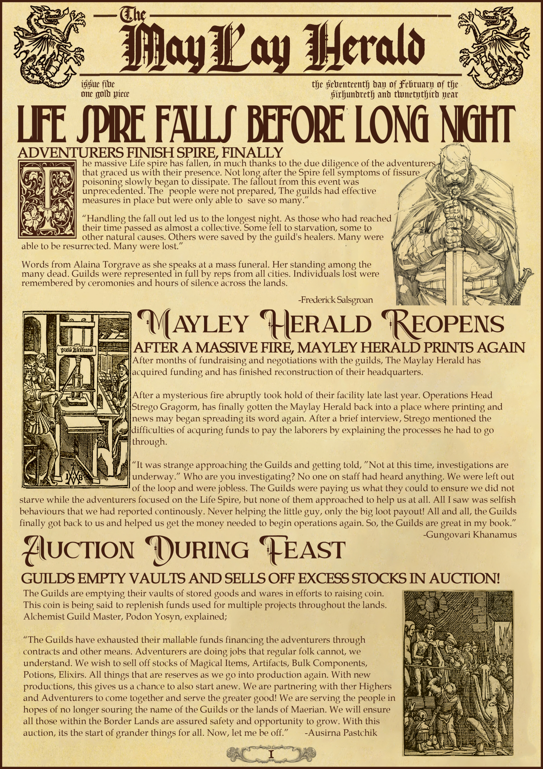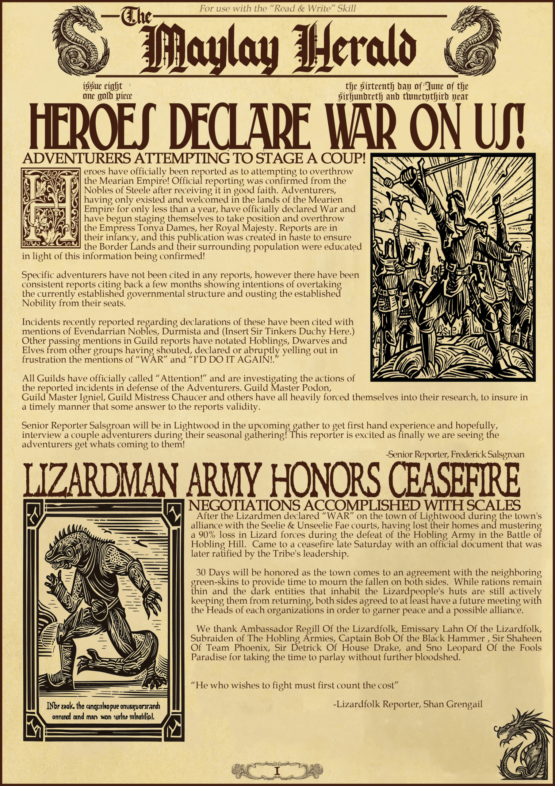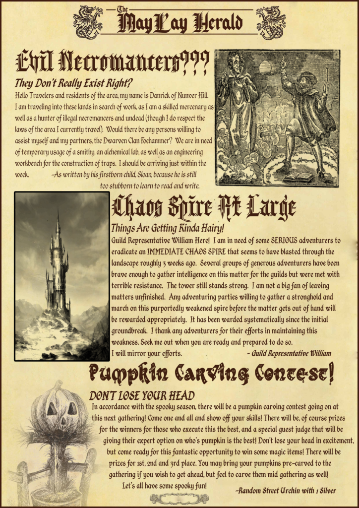 The issues below are the official Mearian Empire Newsletter that is published before every Adventurer Market Gathering. These provide exclusive information that may or may not be necessary for the events following. Be sure to read through them as they provide details that could turn the tide in the battles before you!