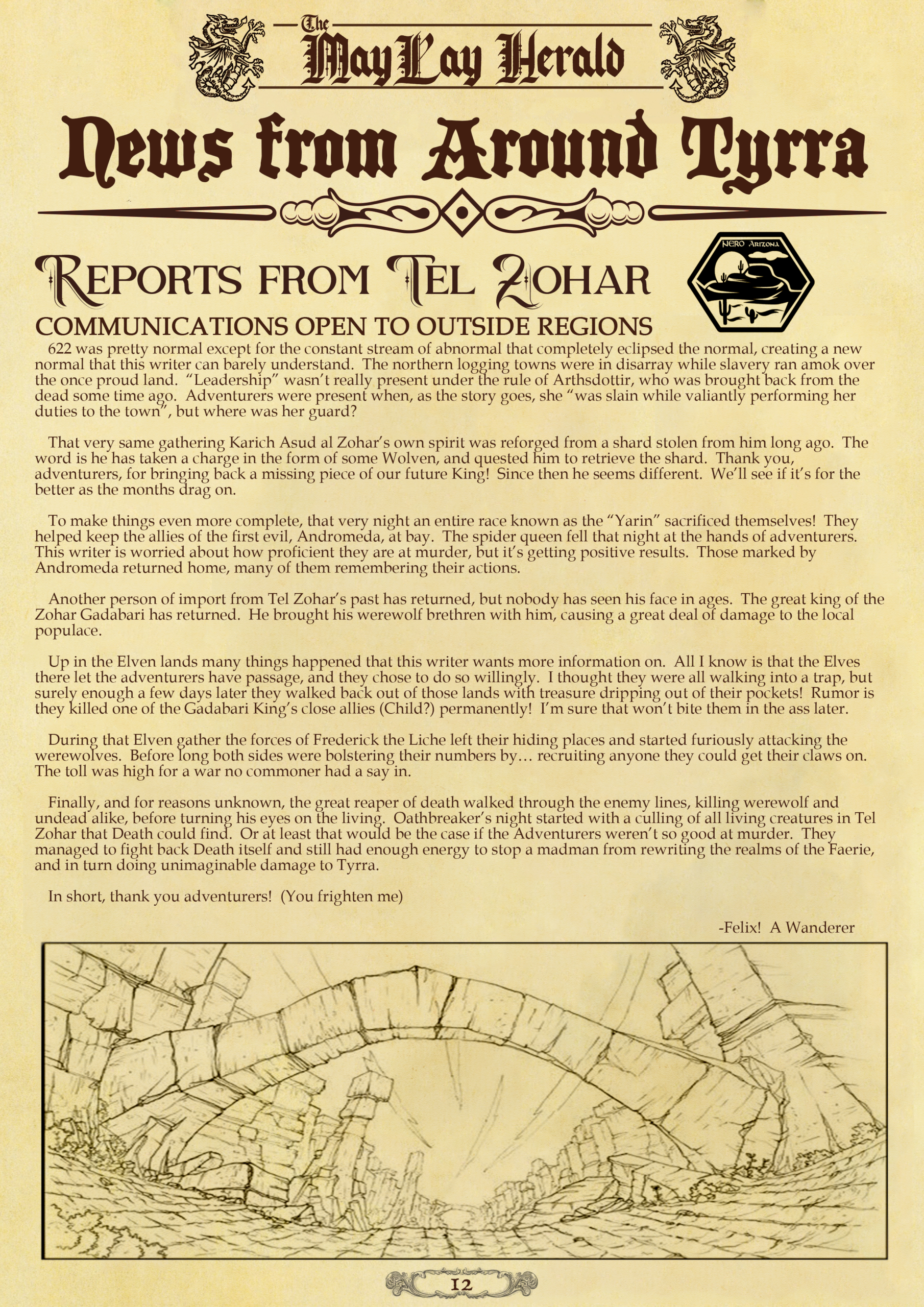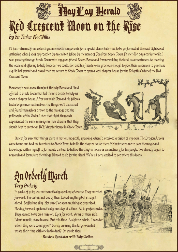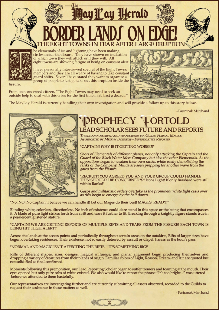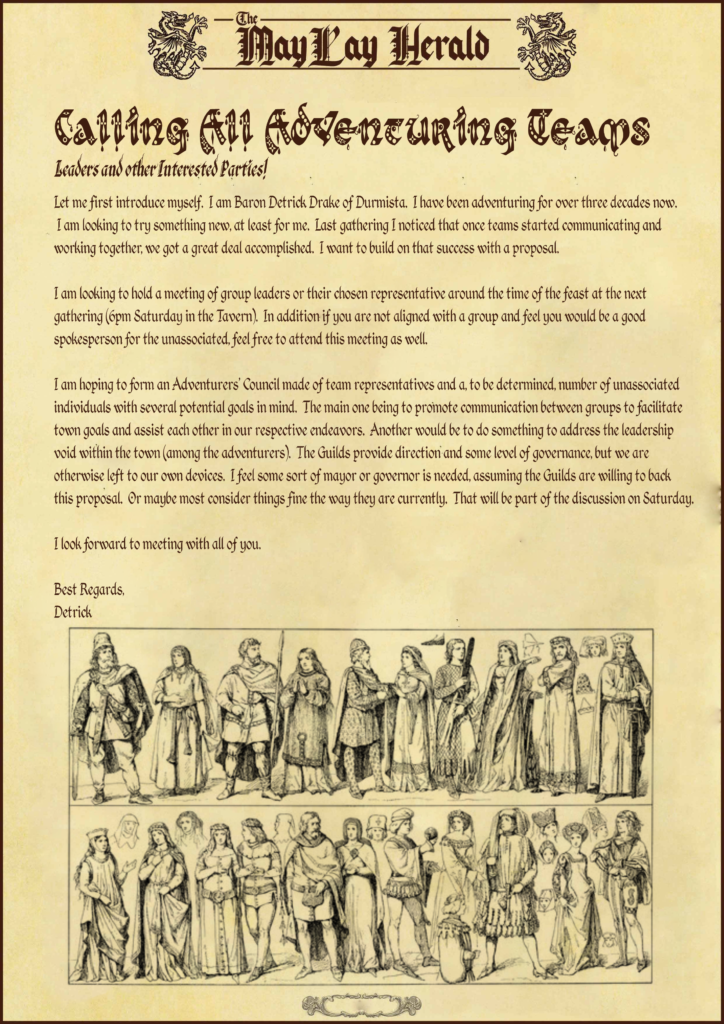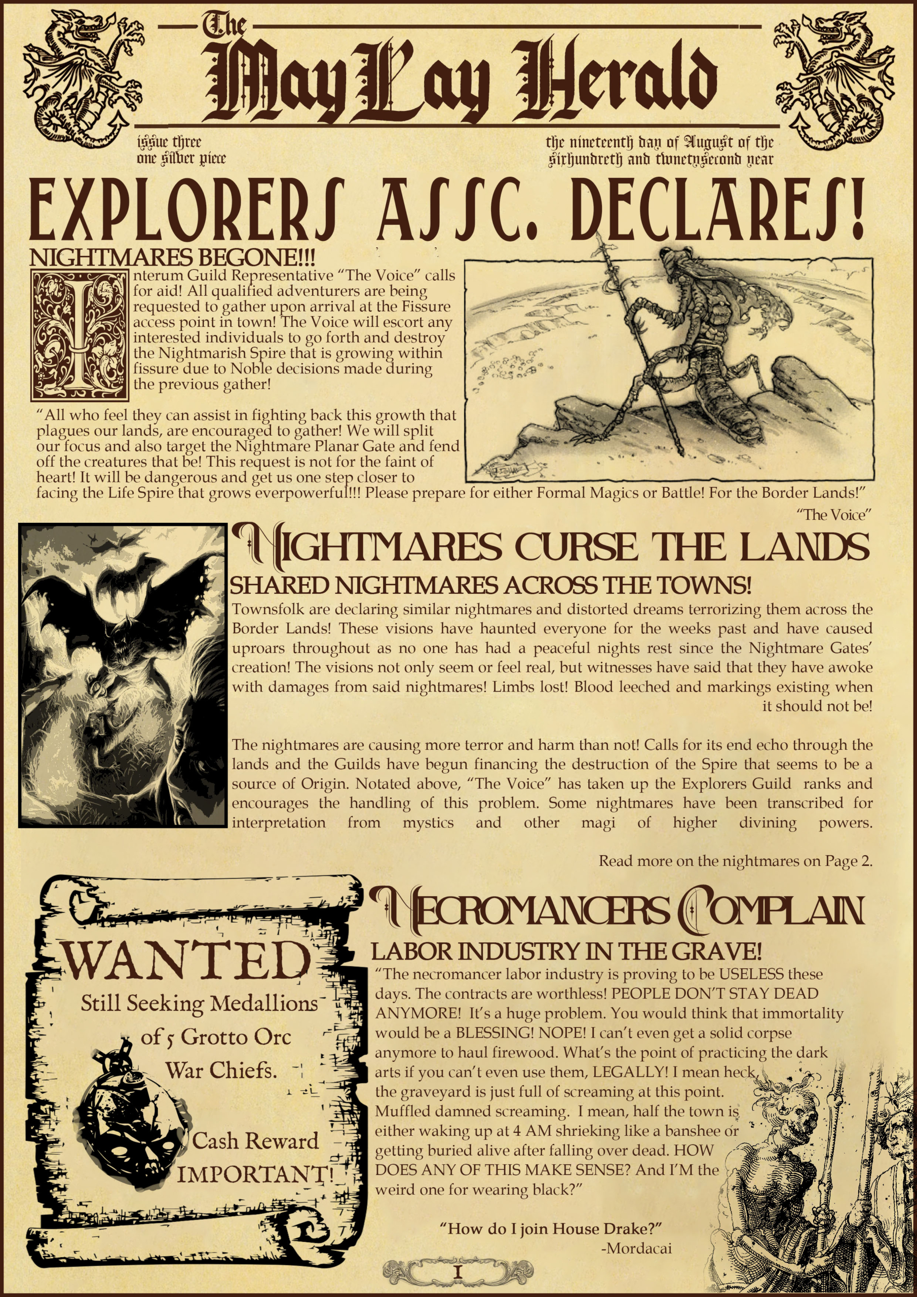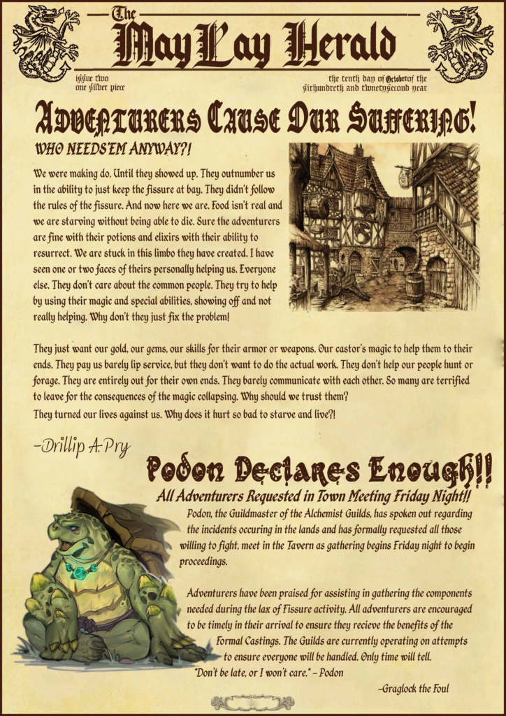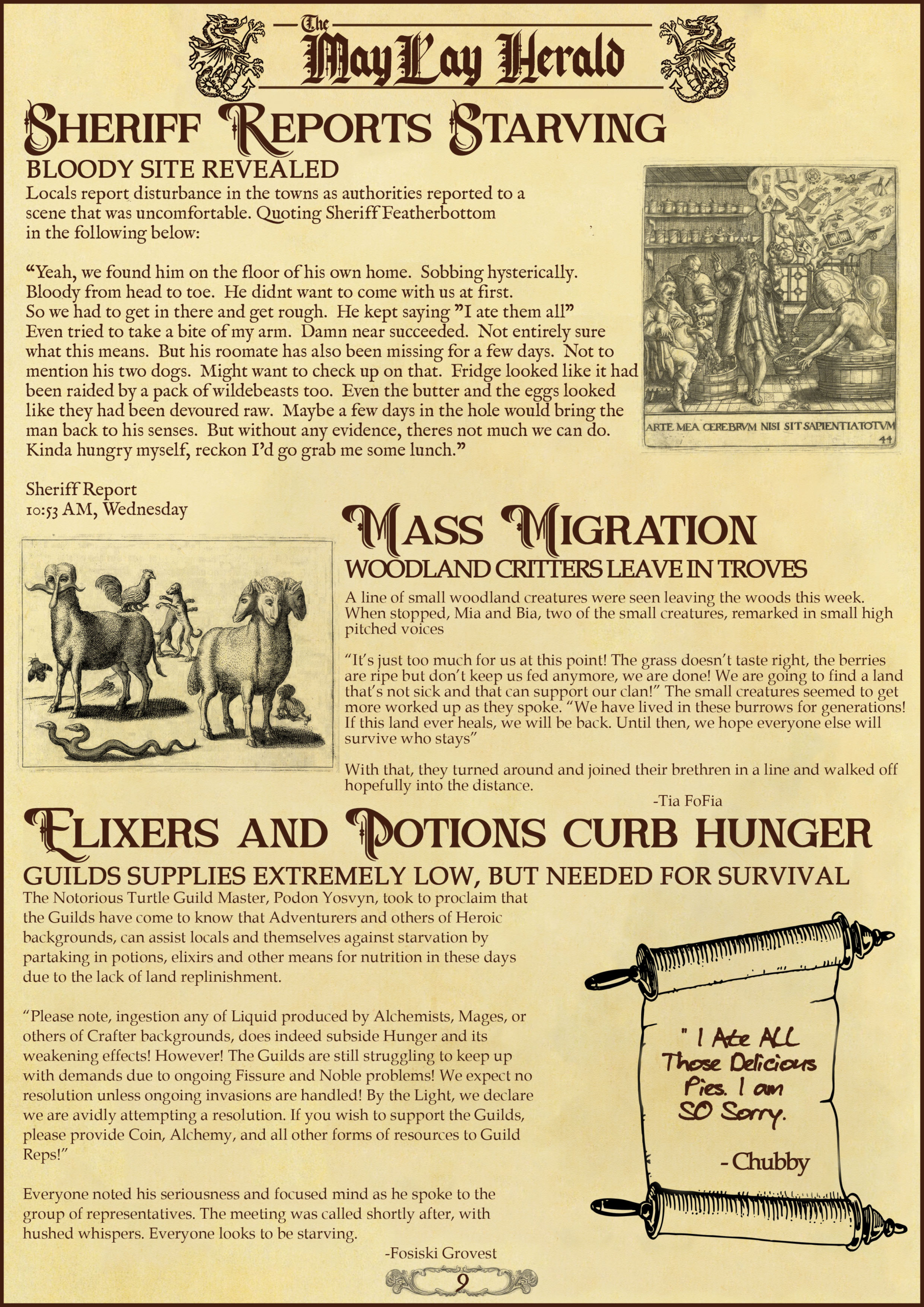 The issues below are the official Mearian Empire Newsletter that is published before every Adventurer Market Gathering. These provide exclusive information that may or may not be necessary for the events following. Be sure to read through them as they provide details that could turn the tide in the battles before you!