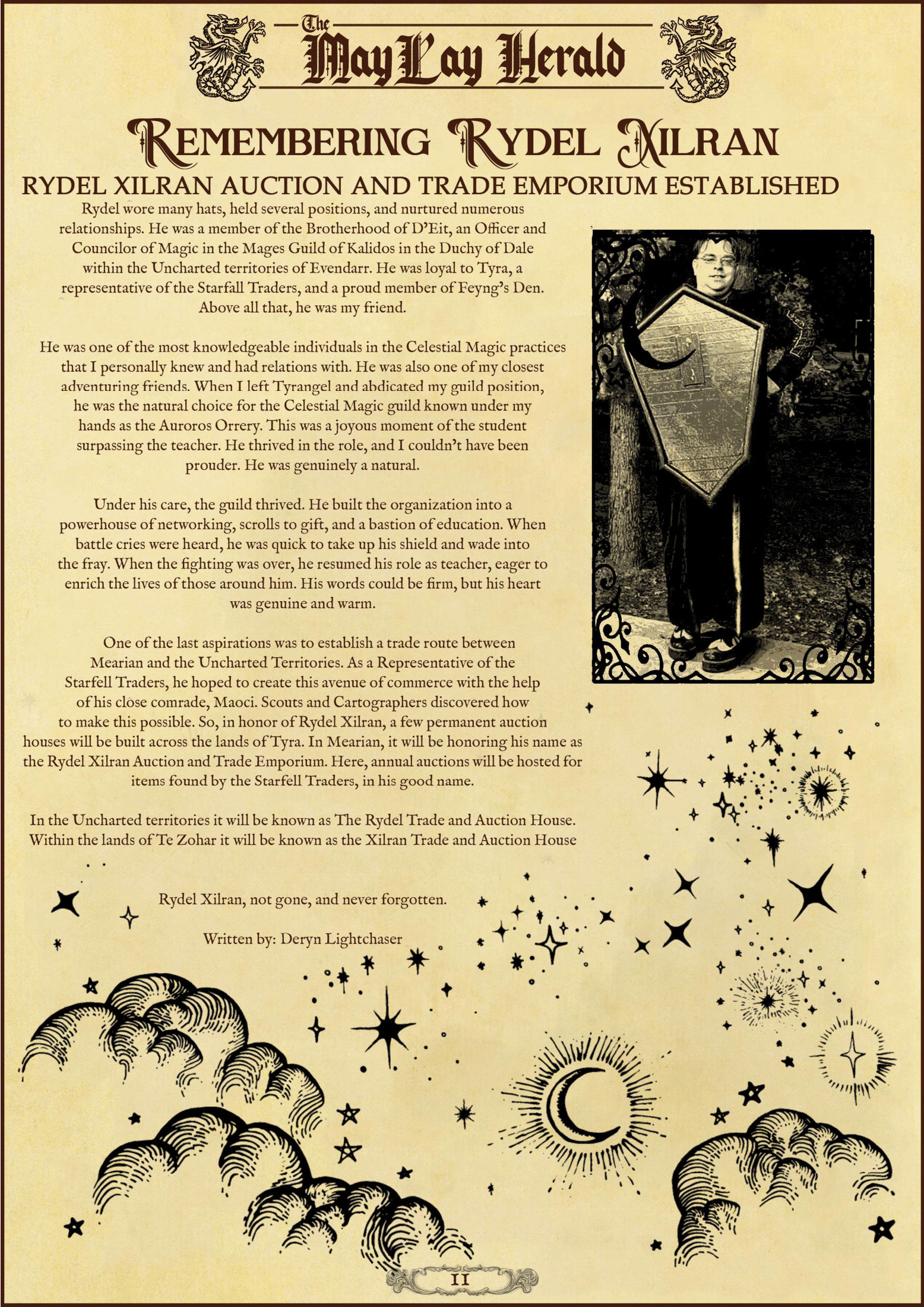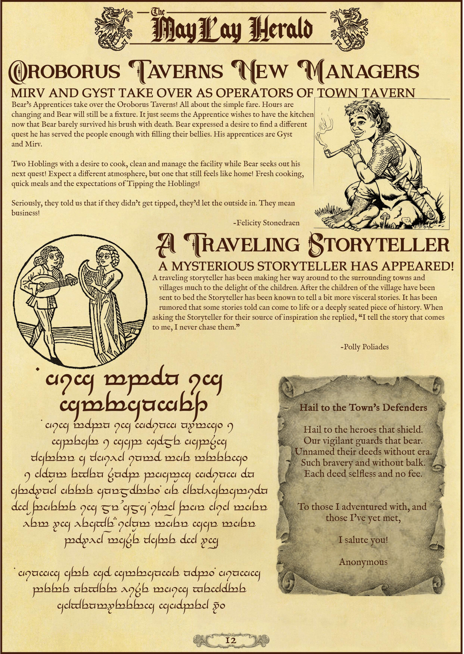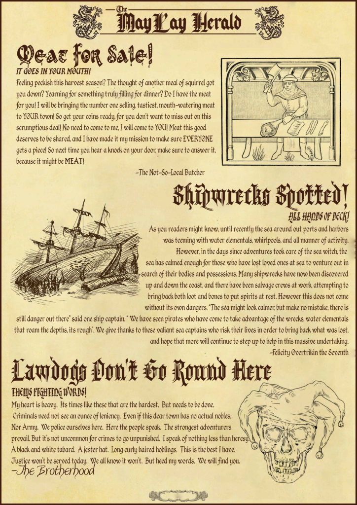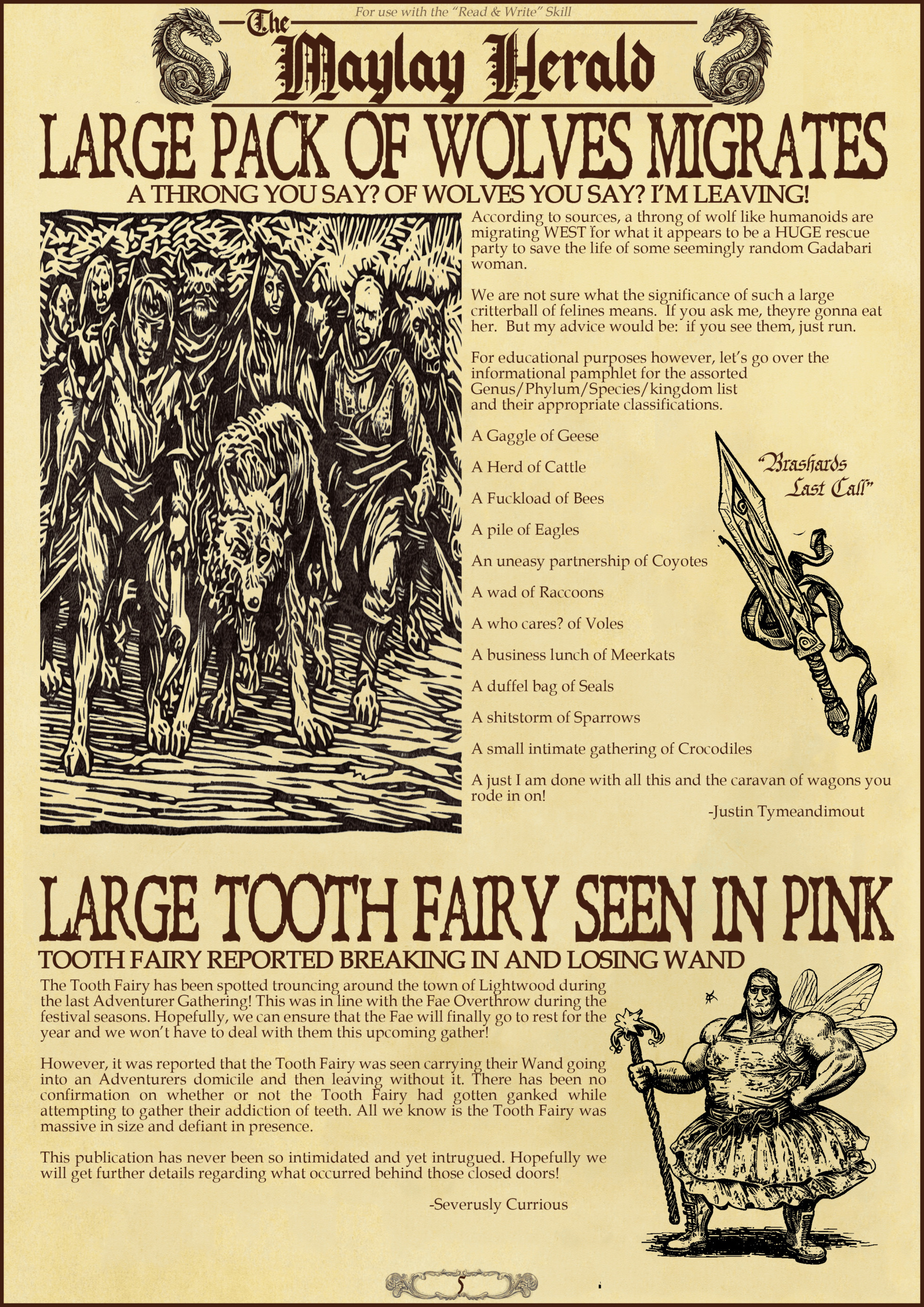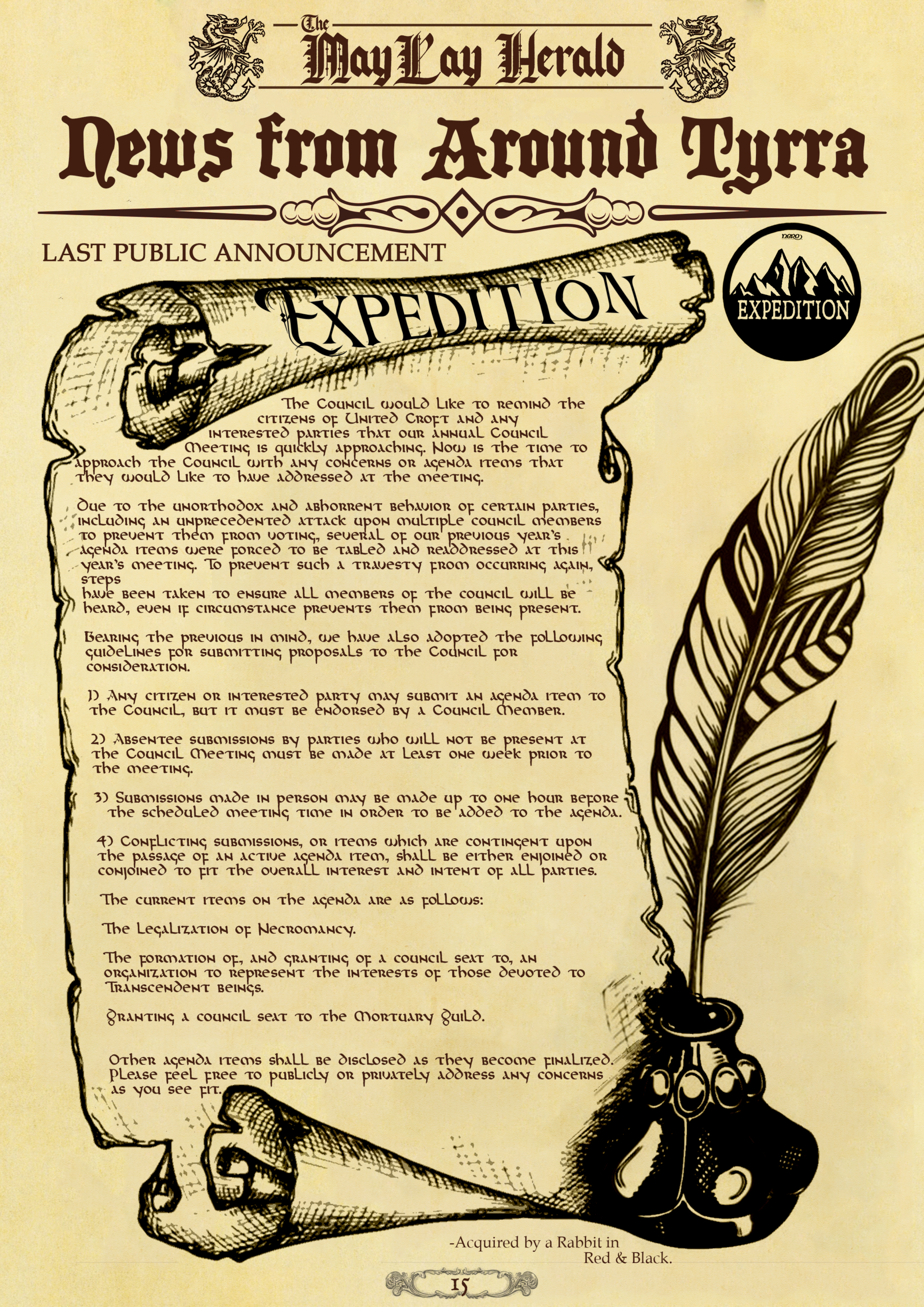 The issues below are the official Mearian Empire Newsletter that is published before every Adventurer Market Gathering. These provide exclusive information that may or may not be necessary for the events following. Be sure to read through them as they provide details that could turn the tide in the battles before you!