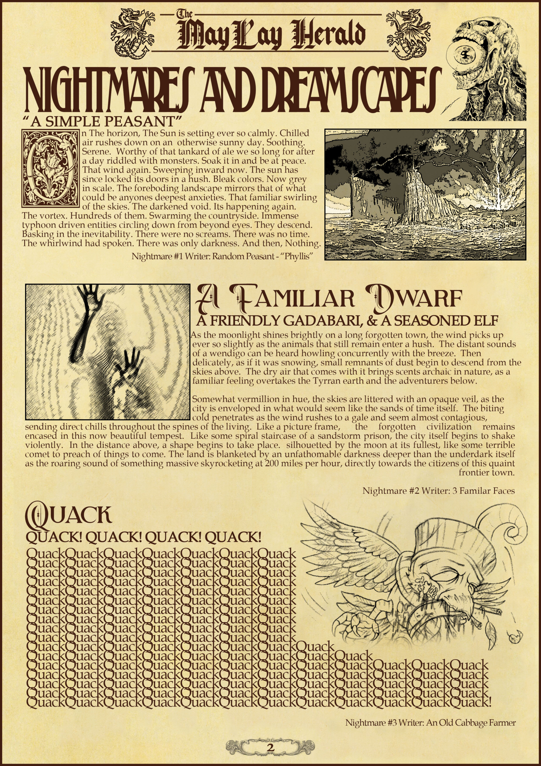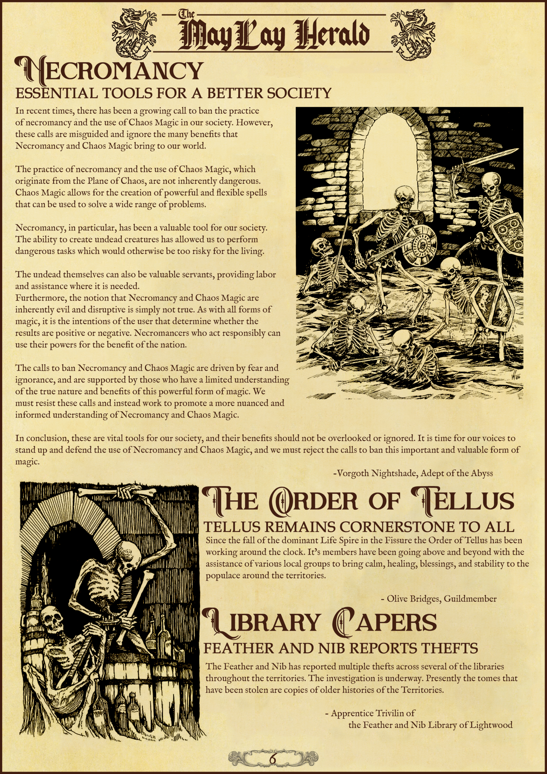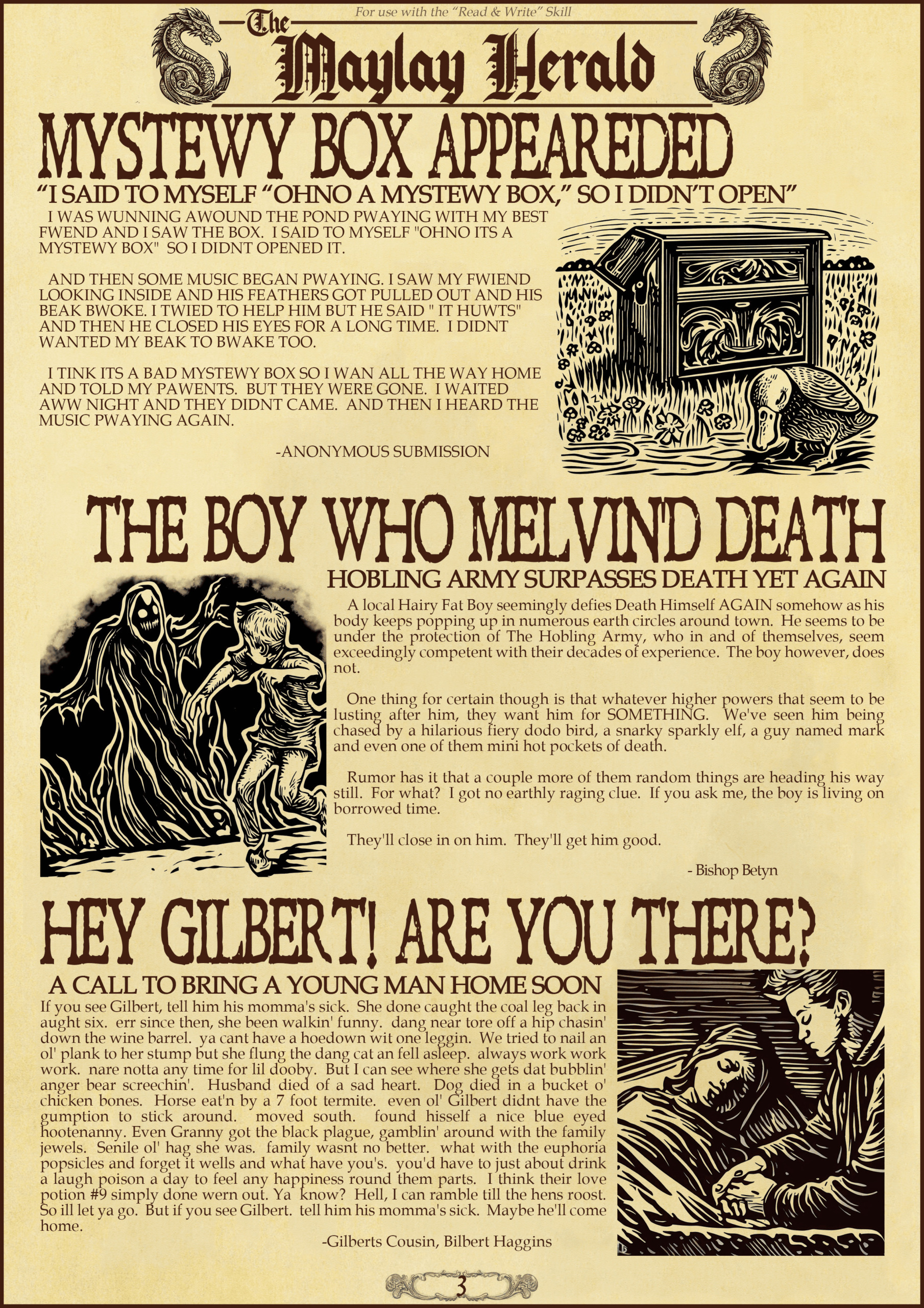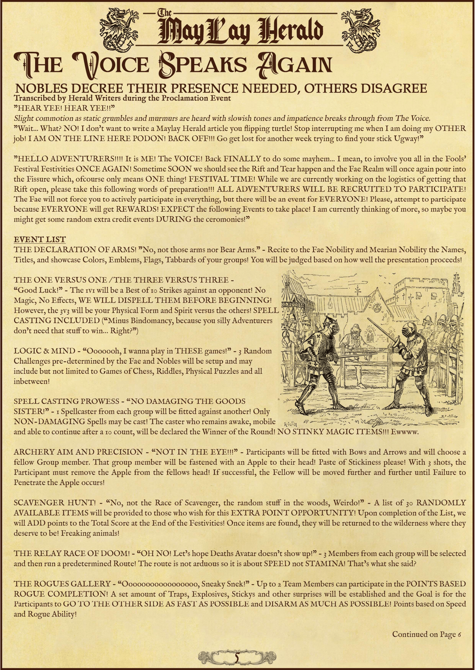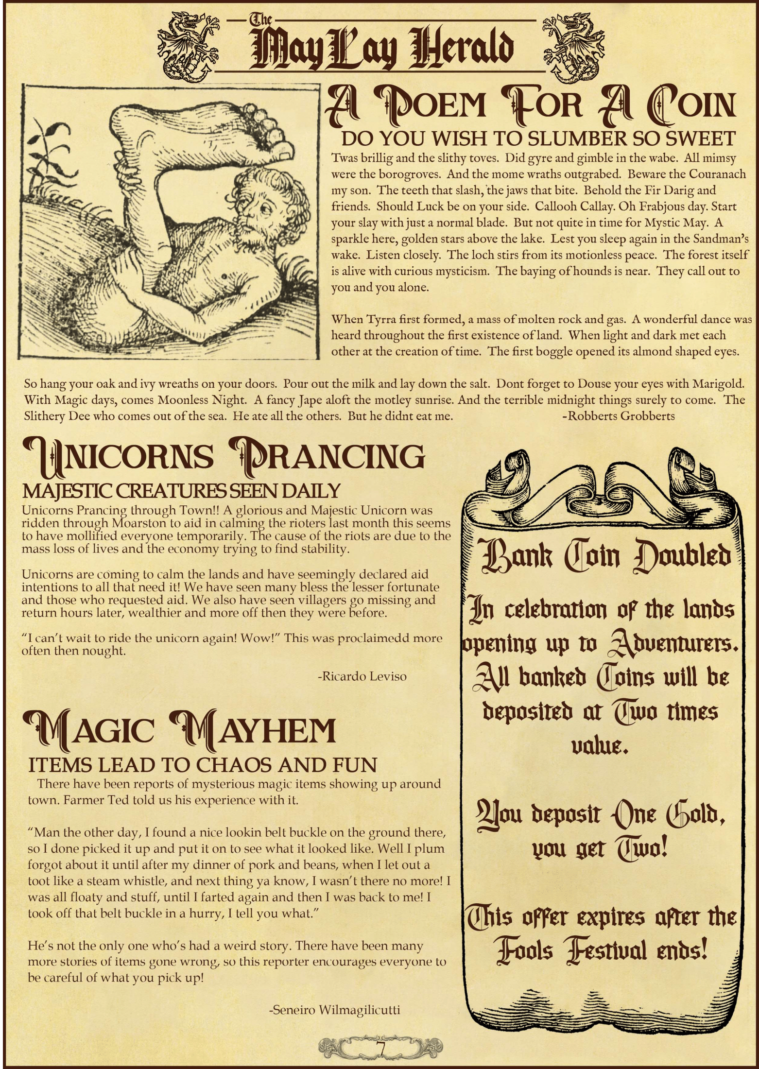 The issues below are the official Mearian Empire Newsletter that is published before every Adventurer Market Gathering. These provide exclusive information that may or may not be necessary for the events following. Be sure to read through them as they provide details that could turn the tide in the battles before you!