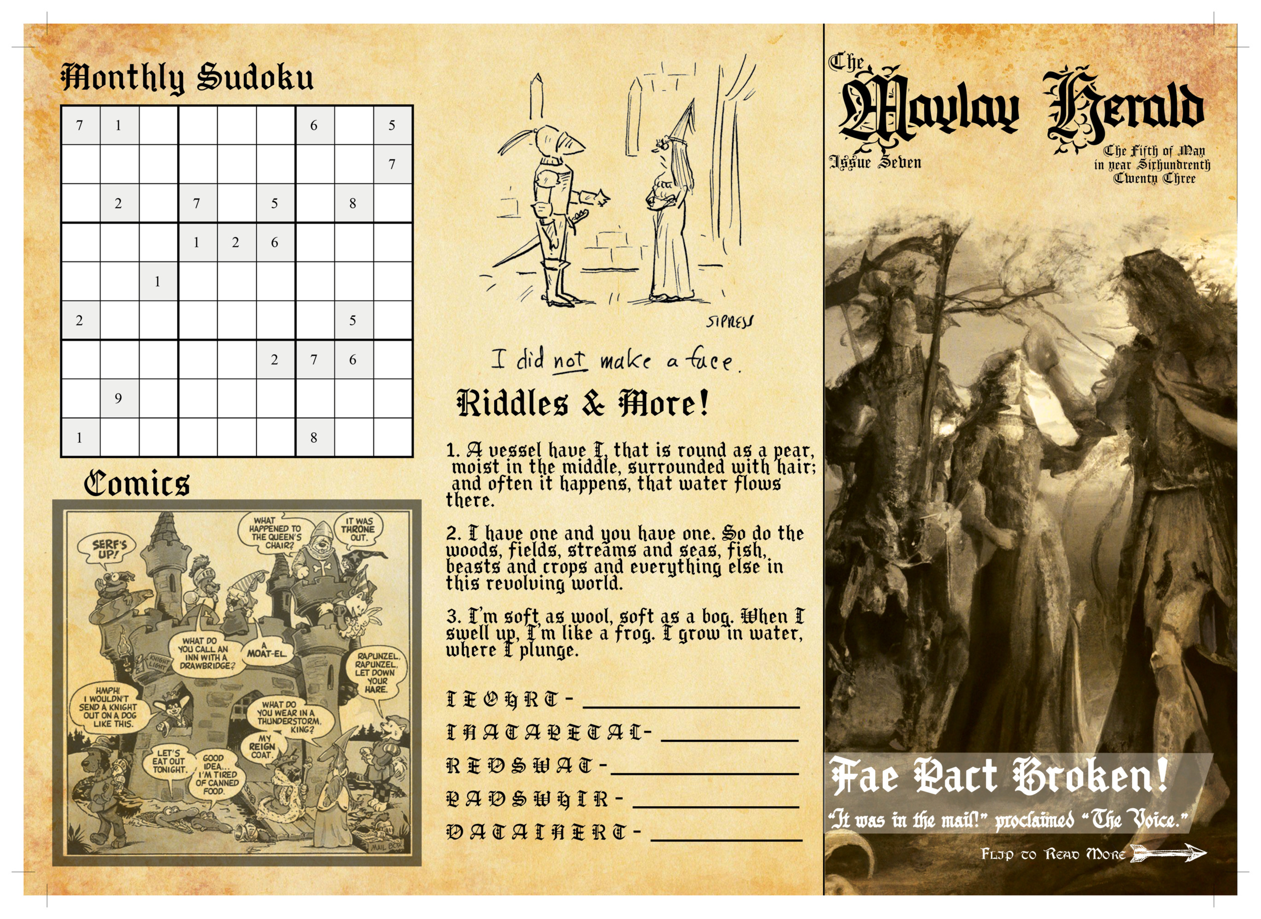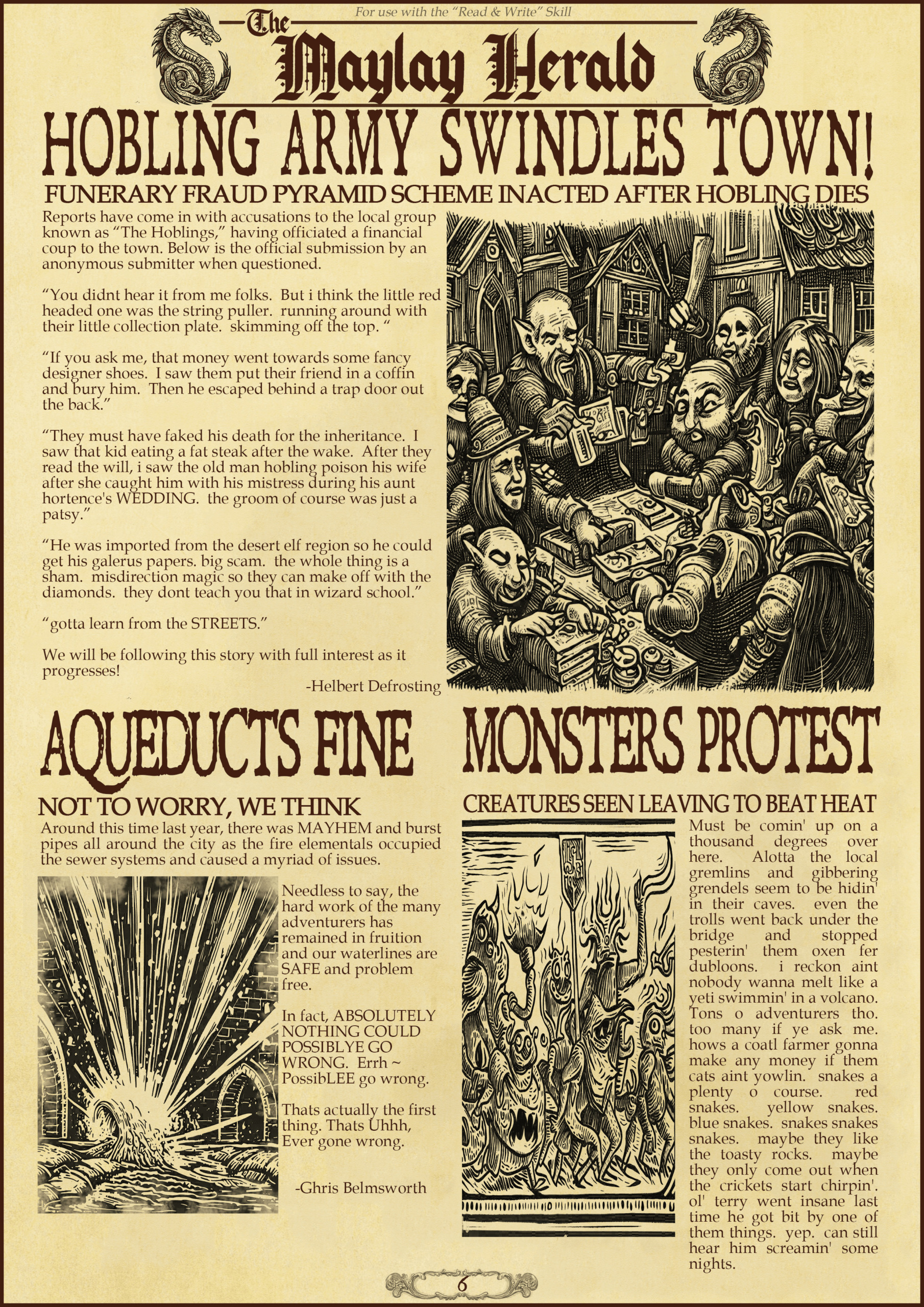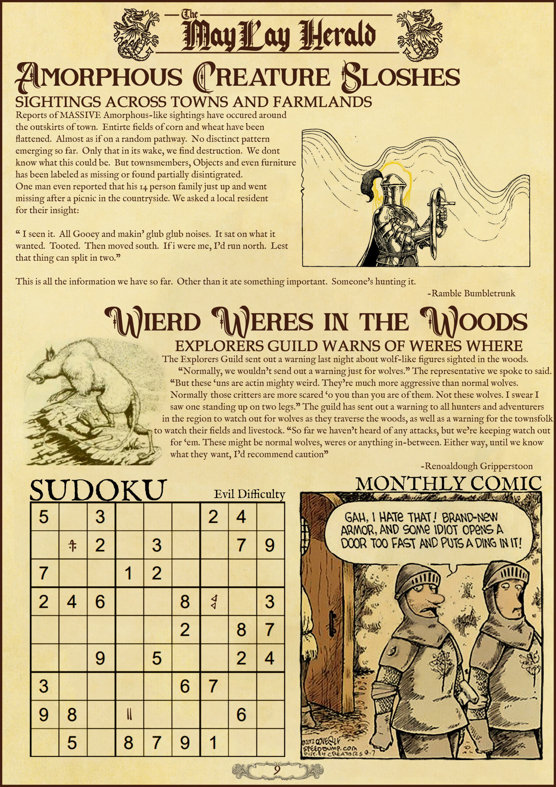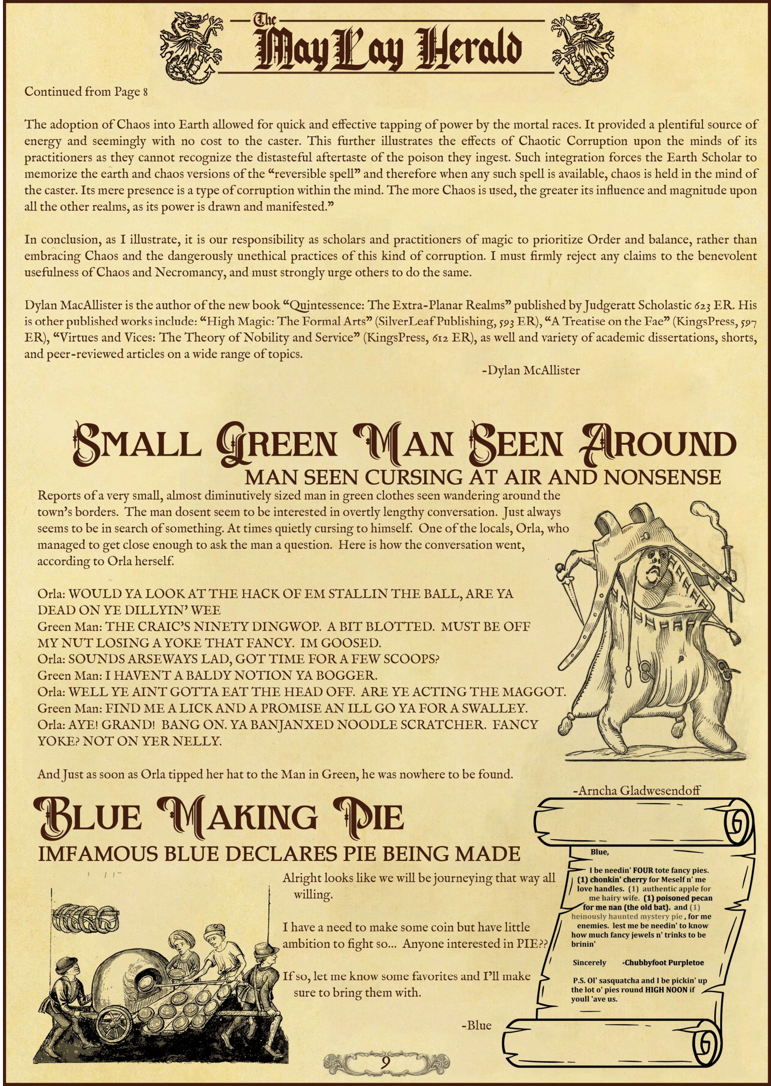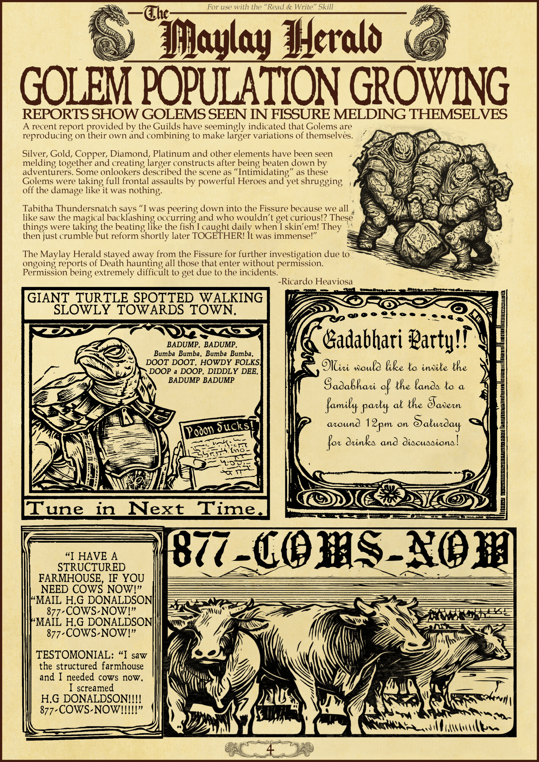 The issues below are the official Mearian Empire Newsletter that is published before every Adventurer Market Gathering. These provide exclusive information that may or may not be necessary for the events following. Be sure to read through them as they provide details that could turn the tide in the battles before you!